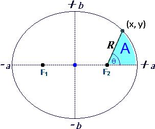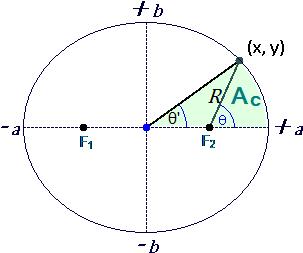 For any given ellipse, the area swept from focal point F1, based on some angle θ, is given as:
