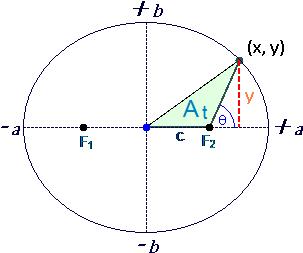 Computing the area of the triangle defined by the three points F2, Center, and (x,y). The basic formula for the area of a triangle is used, which is 1/2 the height (y) times the base (c). Note that the value of c is known for any ellipse - See Appendix D: The equation for the triangle portion then (At) is shown as follows: