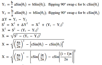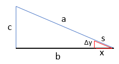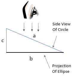 | Viewing the circle with radius 'a' at an angle presents an ellipse with a semi minor axis of 'b', as shown in Figure 6. Using this perspective, the last step is the create a series of triangles to calculate all the values of X that sum up to the circumference of the ellipse. Calculating 'x' of the triangle assummes that the hypotenenuse is 's', and the vertical leg is Δy. Since this is a right triangle, the pythagorean theorem can be used to compute the value of x | |