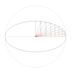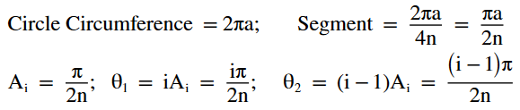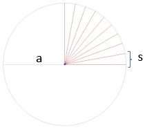 | Start with a circle with radius 'a' (also the semi major axis of the ellipse). Next, divide the circle with radii of equal angles as shown in Figure 1. Note that the number of radii is denoted by 'n' and as will be shown, will approach infinitiy. With the angle of each radii being known (Ai), based on 'n', the length of segment 'S' can be determined by calculating the circumference of the ellipse and dividing by n. Since we are focusing on the first 90 degree quadrant, we also divide by 4. | |