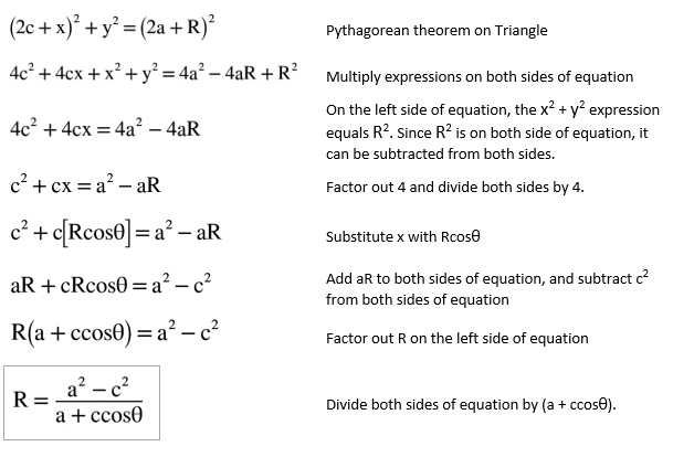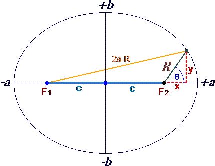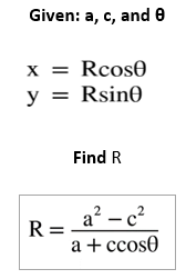Given an ellipse with semi major axis 'a', and semi minor axis 'b'. The calculation below provides the value of the vector magnitude 'R' for any angle θ.